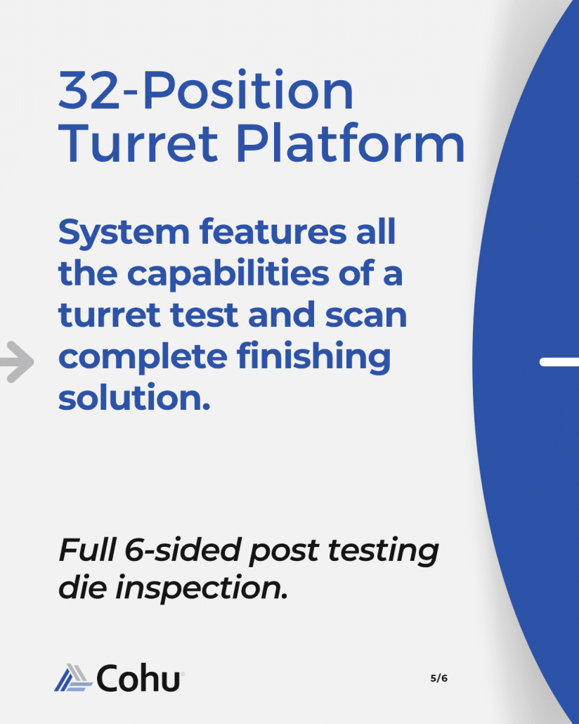 Sense+ system is designed for different MEMS & Sensor applications including inertial, microphone, microphone-loudspeaker(1), pressure(1), and magnet(1). The stimulus module can be used as a standalone unit for engineering or for low volume manufacturing with the possibility of later upgrading to a full production system. The Sense+ system offers all the flexibility of Cohu’s Turrets for loading from Wafer, Tray, Bowl, and Tube.